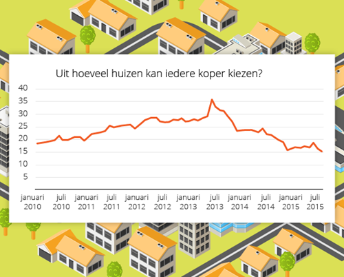 Het aantal te koop staande huizen, gedeeld door het (gewogen) aantal verkopen, bepaalt het aantal huizen per koper. In juni 2013 had je als koper ruim 35 huizen tot je beschikking. Het grootste aantal ooit! Inmiddels is dit aantal gedaald naar ruim 15 in het laatste kwartaal.