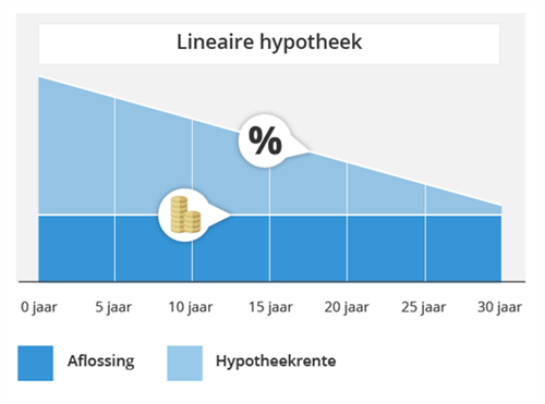 De lineaire hypotheek is de gemakkelijkste hypotheekvorm om te begrijpen. Je lost elke maand eenzelfde gedeelte af. Dat doe je 360 maanden lang (30 jaar), waarna je hypotheek volledig is afgelost. Na 15 jaar heb je dus 50% van je hypotheek afgelost. Door je hypotheek lineair af te lossen, ga je elke maand over een kleiner bedrag rente betalen (steeds 1/360e minder).