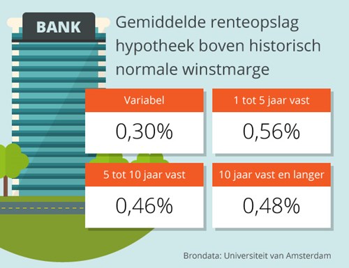 De UvA berekent periodiek hoeveel extra winst banken maken ten opzichte van de ‘historisch normale winstmarge’. In de onderzochte periode verdubbelde die extra renteopslag bijna van 0,25 tot 0,48 procentpunt. Het grootst is de opslag bij de rentevaste perioden van 1 tot 5 jaar.