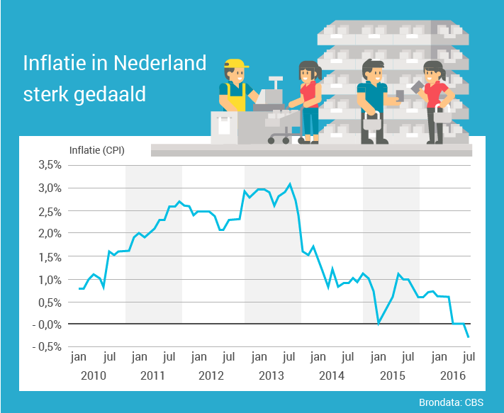 De Europese Centrale Bank (ECB) verstrekt banken leningen tegen een historisch lage rente. Eén van de redenen hiervoor is de lage inflatie in Europa. De prijsstijging van producten en diensten ligt ver onder het gemiddelde dat de ECB nastreeft. In Nederland ligt de inflatie afgelopen juli, voor het eerst sinds 1984, zelfs onder het nulpunt (0,30 procent). Het leven werd dus goedkoper.