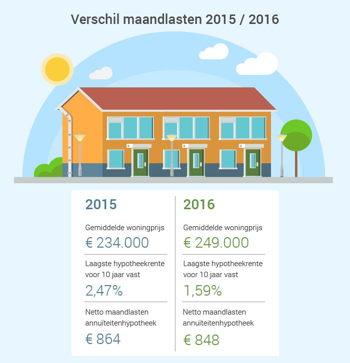 Een koper uit 2016 is dus nog nét iets goedkoper uit dan iemand die vorig jaar een huis kocht. Er is wel een kanttekening. De netto maandlast is een gemiddelde van alle aflostermijnen over de volledige looptijd van de hypotheek. Zou je kijken naar de maandlasten in het eerste jaar van aflossing, dan is de eigenaar uit 2015 iets goedkoper uit: € 775 om € 793 in 2016.