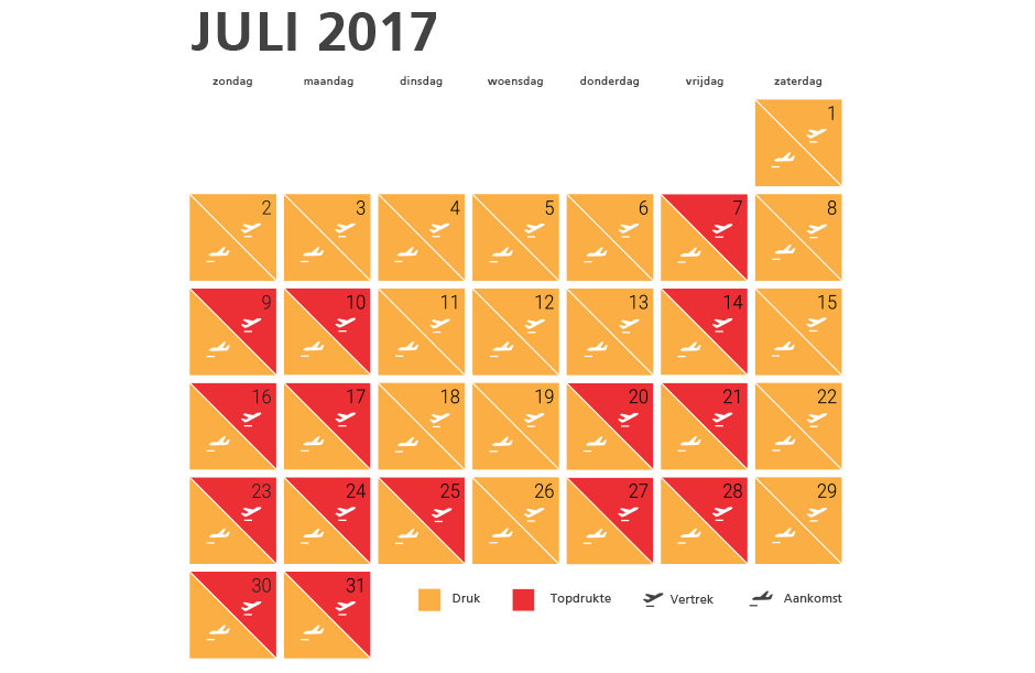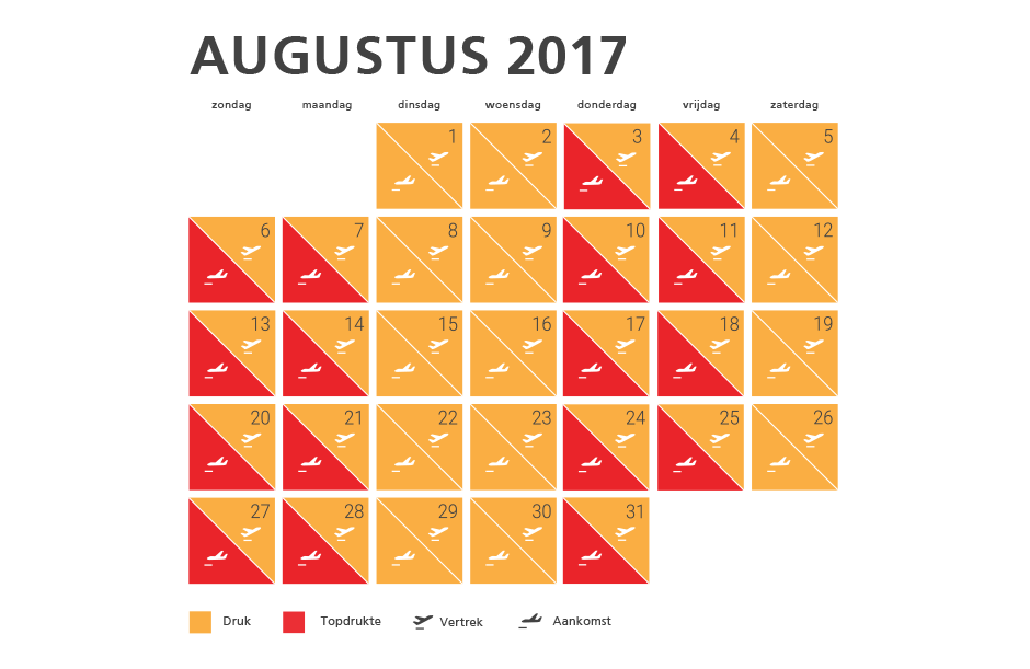 De druktemeter van Schiphol laat zien wanneer de luchthaven zelf de meeste passagiers verwacht. Handig om te bekijken als je zelf ook in juli of augustus op vliegvakantie gaat. Wordt topdrukte verwacht, zorg dan dat je nog ruimer voor vertrek aanwezig bent.