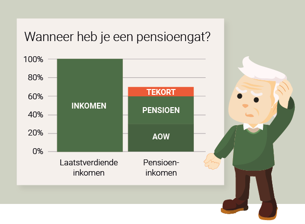 Je kunt spreken van een pensioentekort wanneer je minder dan 70 procent van je laatstverdiende salaris krijgt uitgekeerd als pensioen. Of dat echt te weinig is, hangt af van je persoonlijke situatie. Stel dat je hypotheek (grotendeels) is afgelost en je kinderen zelfstandig zijn, dan kun je wellicht met minder af. Het lastige is dat je daar echter niet op kunt rekenen zolang je nog niet toe bent aan je pensioen.