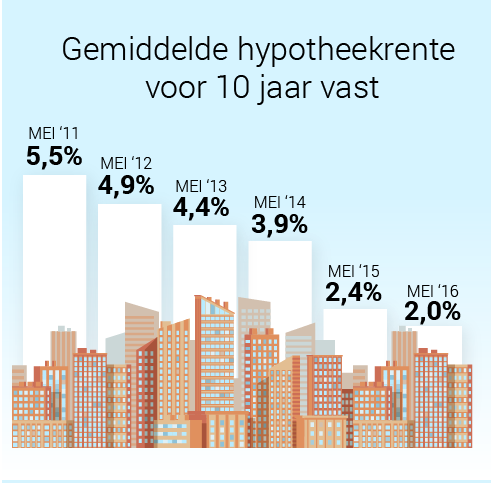 Wanneer zette de daling van de hypotheekrente in? De laatste top werd bereikt in mei 2011. Toen betaalde je gemiddeld 5,5 procent hypotheekrente voor 10 jaar vast. In mei 2013 was daar al 1,1 procent vanaf: 4,4. Maar de echte val moest toen nog komen. Tussen mei 2014 en mei 2015 daalde de hypotheekrente met 1,5 procent! Van 3,9 naar 2,4 procent.