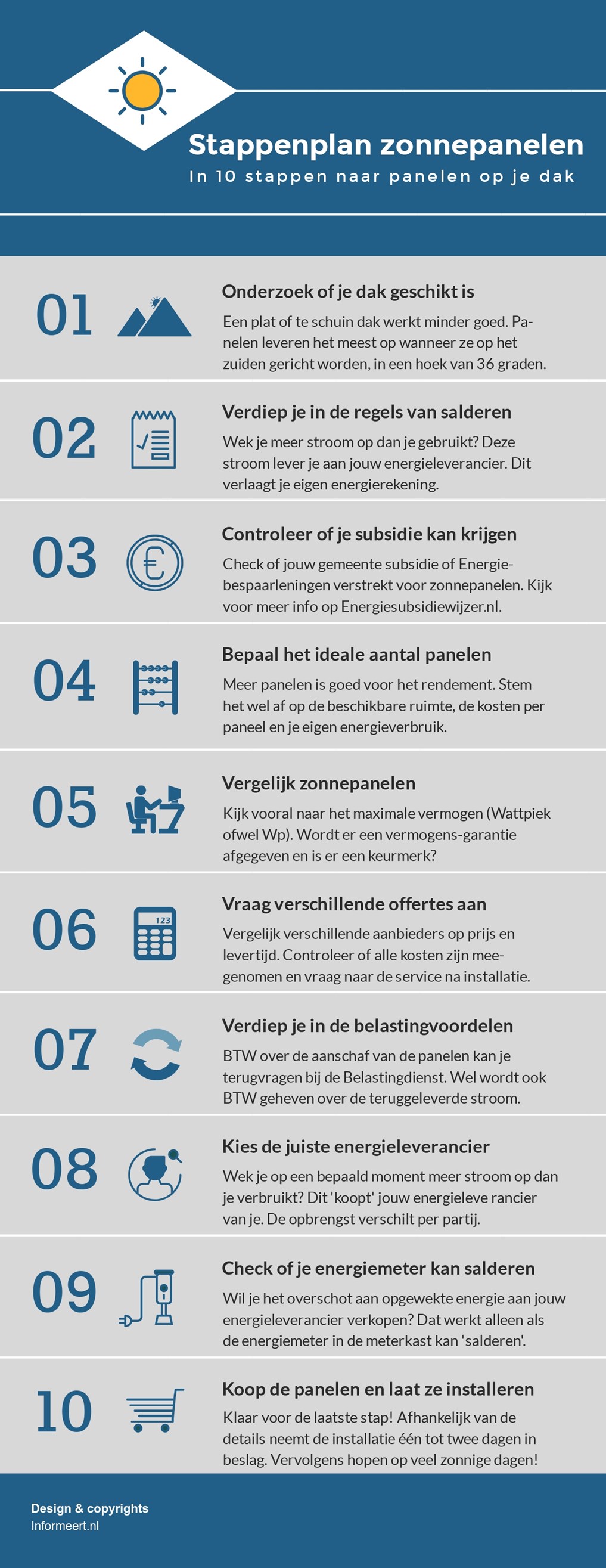 Het opwekken van stroom met zon, water of wind is niet het specialisme van Maatwerk-hypotheek. Vraag ons dan ook niet welk soort paneel jij het best op je dak kan leggen of wat de exacte opbrengst is van een bepaald type. Wel helpen we je graag op weg met de onderstaande infographic. Met het stappenplan bepaal je of de installatie van zonnepanelen iets voor jou is en hoe het aan te pakken.