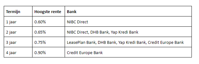 Sluit je een deposito af, dan zet je de rente voor een bepaalde tijd vast. De bank kan in die tijd over jouw geld beschikken en beloont dit doorgaans met een hogere rente. Onderstaand de hoogste spaarrentes voor verschillende termijnen: