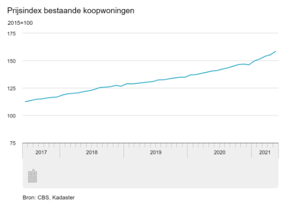 In juni 2013 bereikten de woningprijzen een dieptepunt. Sindsdien is er sprake van een stijgende lijn. Zo lag de prijsindex voor bestaande woningen in mei dit jaar op het hoogste niveau ooit. Vergeleken met het dal in 2013 zijn de prijzen in mei met 66,8% gestegen. Stel je kocht destijds een gemiddelde woning van €200.000. Inmiddels zou je voor dezelfde woning circa €333.600 betalen.
