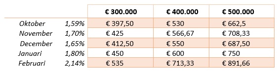 De onderstaande bedragen geven aan wat je bruto kwijt bent aan rente. In de praktijk komt hier vaak de aflossing bovenop, tenzij je een aflossingsvrije hypotheek hebt. Daarnaast heb je mogelijk het voordeel van hypotheekrenteaftrek, waardoor de netto last lager ligt.