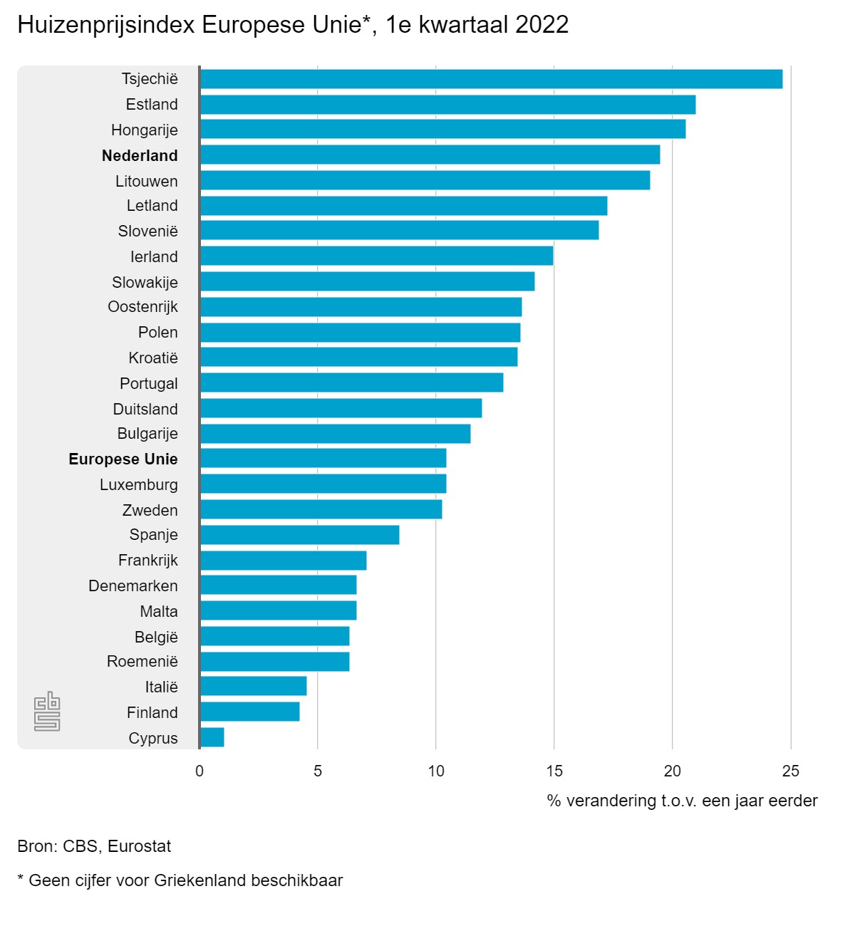 De gemiddelde huizenprijs is in Nederland gemiddeld 19,5 procent gestegen in het eerste kwartaal van 2022. Hiermee behoren we tot de koploper in de Europese Unie. Er zijn maar drie andere landen waarbij de huizenprijzen nog explosiever toenamen.