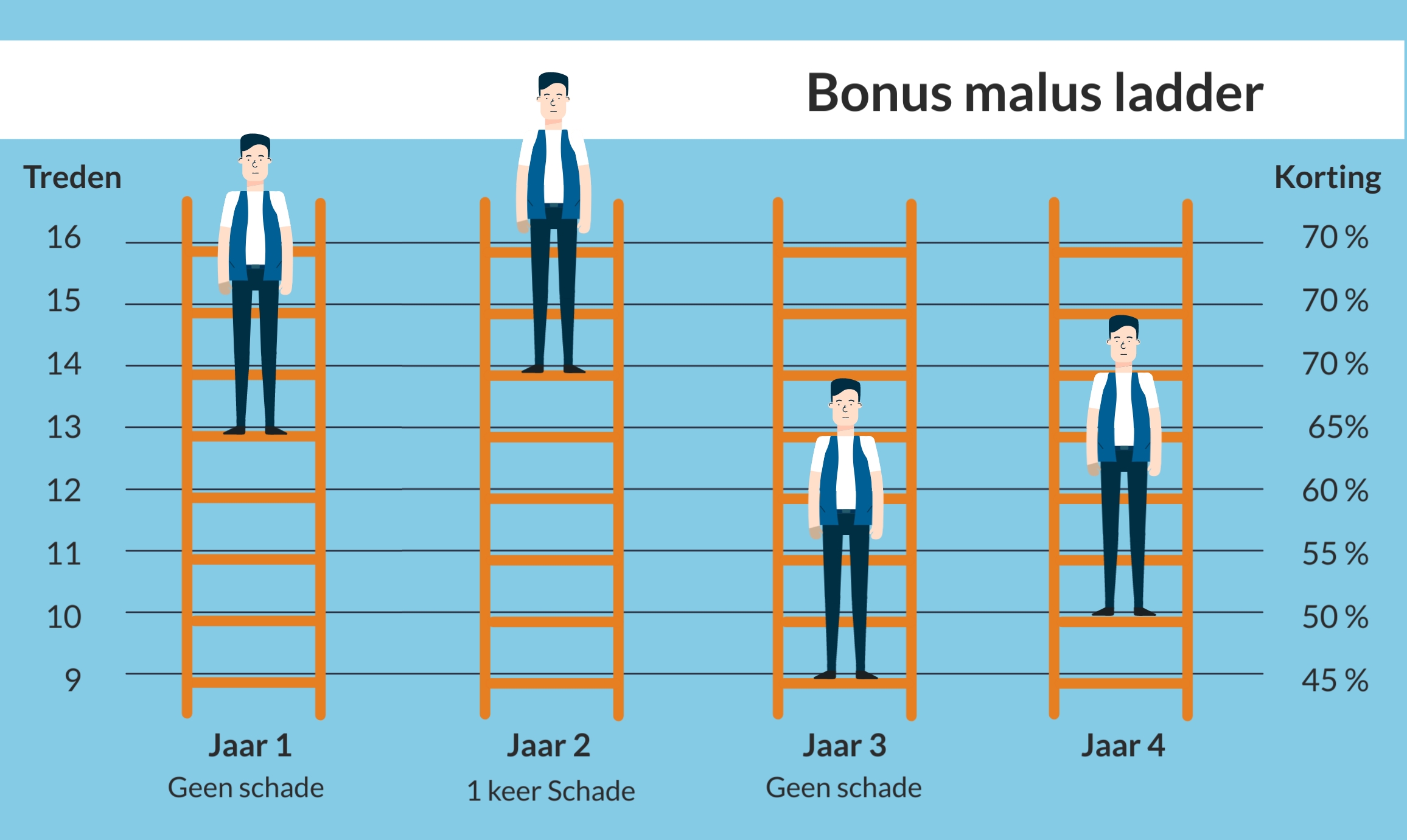 Verzekeraars hanteren vaak een staffel om de korting over je schadevrije jaren te berekenen. Dit heet ook wel de bonus-malus ladder. De verzekeraar kan zelf bepalen uit hoeveel treden deze ladder bestaat. Hoe hoger de ladder, des te hoger de korting op de premie. Vaak is de korting op de hoogste aantal treden hetzelfde om de lage premie voor je veilig te stellen. Ter verduidelijking zie je het effect in het onderstaande beeld.