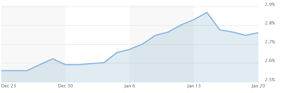De rente op hypotheken met een rentetermijn vanaf 10 jaar volgt die van Nederlandse staatsobligaties. Dit zijn leningen die de overheid uitgeeft. De rente hierover bedroeg begin dit jaar nog 2.59 procent. Vorige week stond er 2.87 op de borden. Een fors verschil. Het is niet zo dat de hypotheekrente een-op-een de rente op staatsobligaties volgt. Wel houden geldverstrekkers deze rente aan als uitgangspunt bij het vaststellen van hun tarieven.